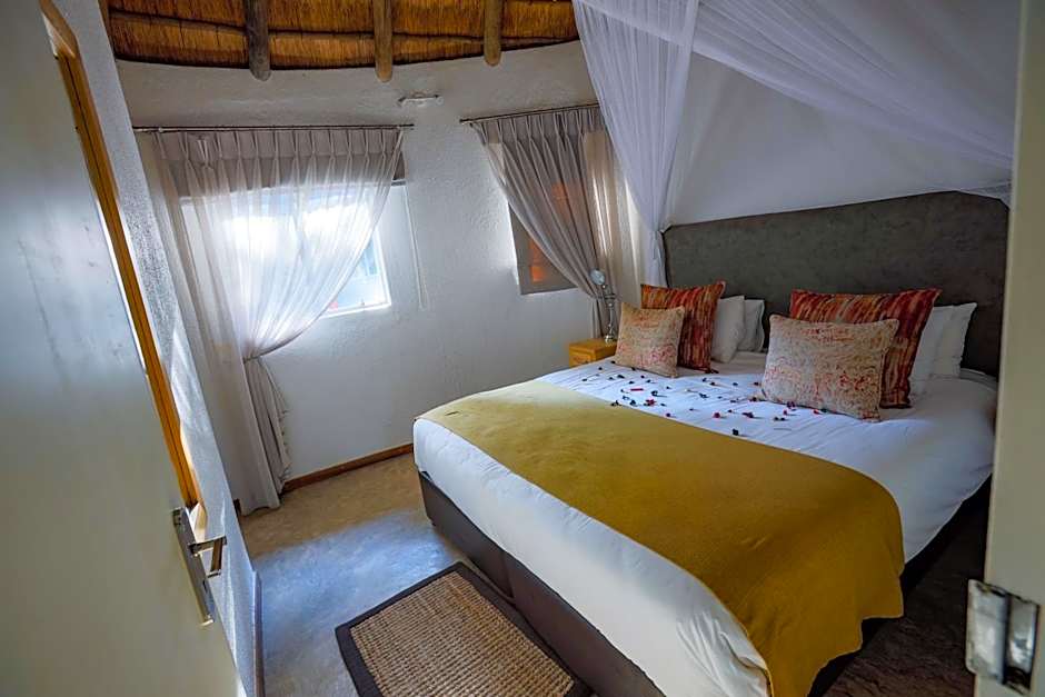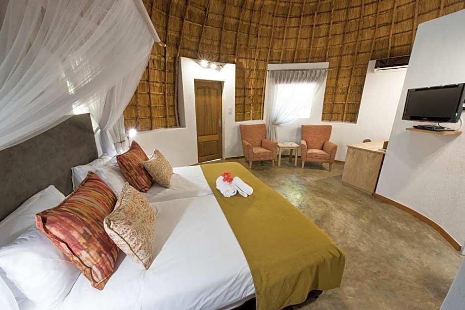 This rounded room with a grass-thatched roof, traditionally known as a 'rondavel', is styled in an African theme. The room is set in a tropical garden. Each room is equipped with mosquito nets, air conditioning and an outside seating area.